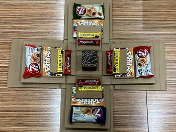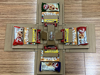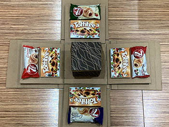 U druhé bych prohodila Toffifee a croissant, aby se krabice po sundání víčka otevřela lépe.