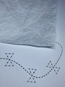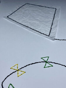 Potom děti vyšijí nejprve hlavu (stehy přes čtvrtku i pečící papír) – já vyšívala černo-stříbrnou bavlnkou. Když je celá hlava přichycená, sundejte kancelářské sponky a odstřihněte nůžkami cca 1 cm za přišitím. Pokračujte s vyšitím ocásku a mašliček na něm.