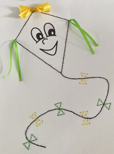 Barevné provedení nechte na dětech nebo zvolte podle barevnosti bavlnek, které máte doma. Já jsem základ draka vyšila černou barvou a mašličky žlutou, zelenou.