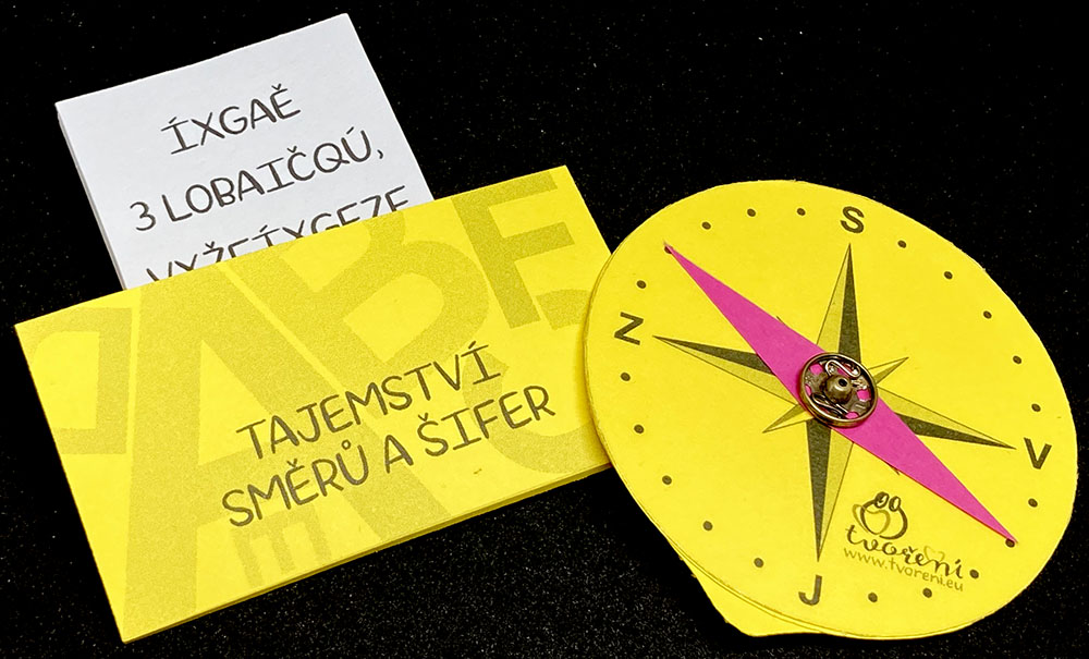 - kompas pro malé děti, pro starší děti z druhé strany šifrovací kolečko + úkoly opět pro obě věkové skupiny, mladší děti kartičky na dokreslení obrázků, starší děti šifrované úkoly