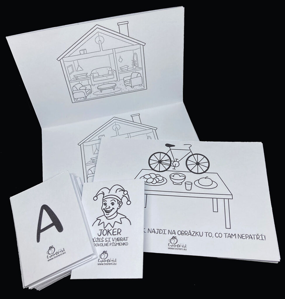 - hry – pro nejmenší děti hledání co na obrázek nepatří, pro starší děti hledání rozdílů na obrázcích a kartičky s písmenky na slovní kopanou
