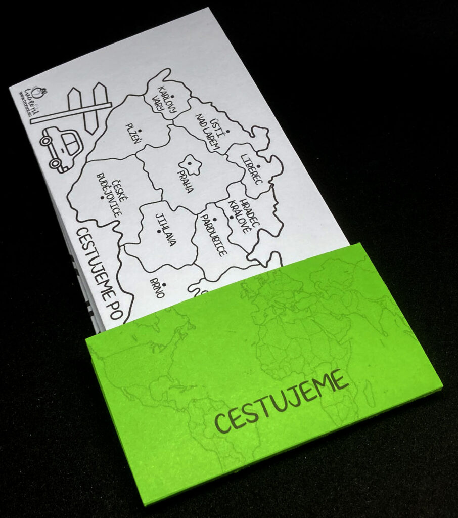 - cestujeme – tři druhy map, pro nejmenší děti mapa na dokreslení trasy do hor, pro starší děti mapa České republiky a Evropy na zapisování a zakreslování navštívených míst.